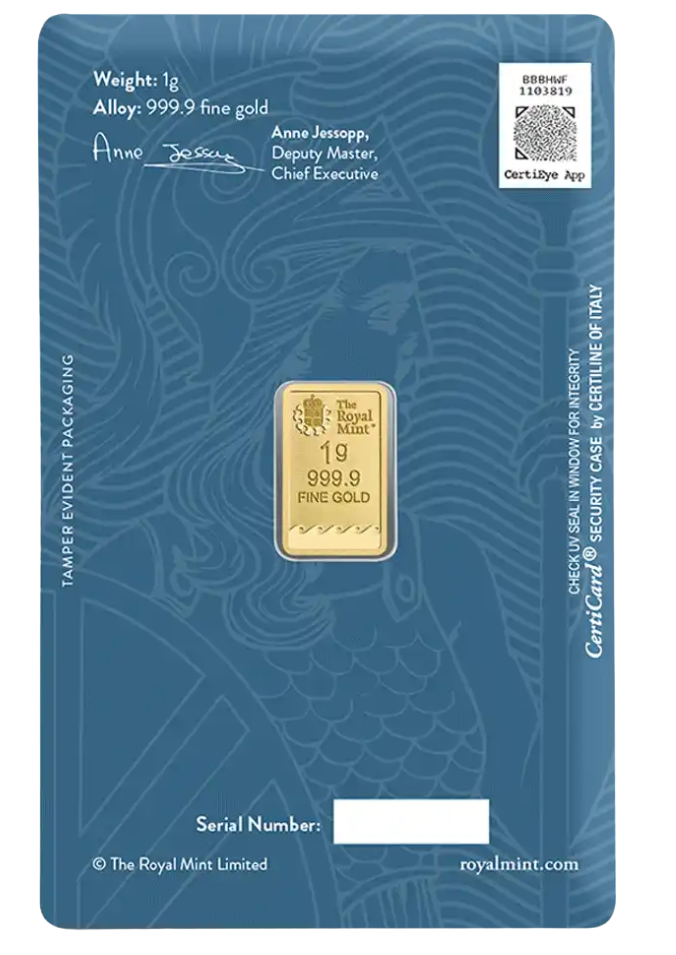 Your brand new 1g Royal Mint Britannia gold bar will be delivered free of charge, with fully insured delivery, offering convenience and peace of mind.