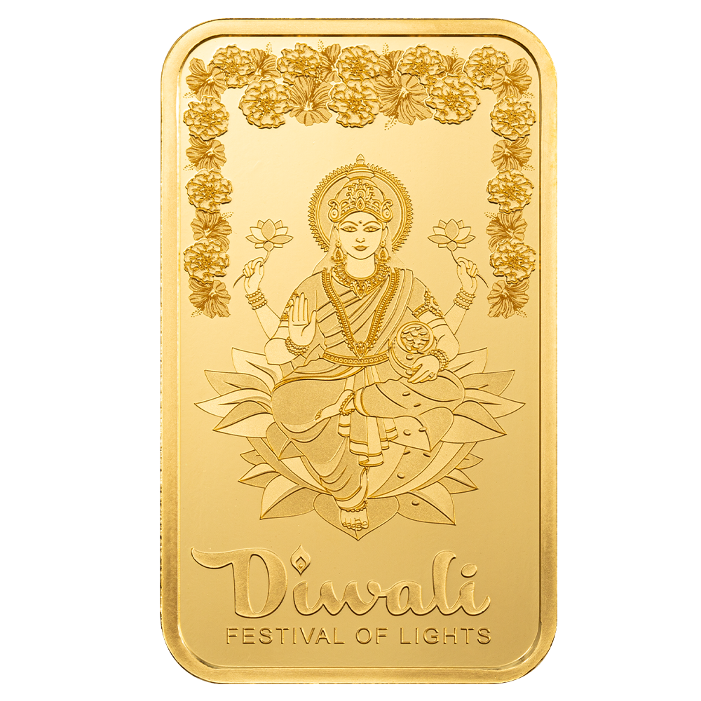 Introducing our exquisite 1 ounce PAMP Diwali Lakshmi & Rangoli pure gold bar, Lakshmi, the goddess of wealth and good luck is surrounded by a garland of marigolds and hibiscus flowers which represent wealth and cleanliness. Made for 2025.