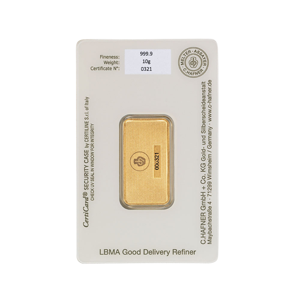 Our German-made 10 gram C.Hafner gold bars boast 24 Carats, 99.99% purity, and are LBMA approved, making them a great option for first-time investors and collectors.