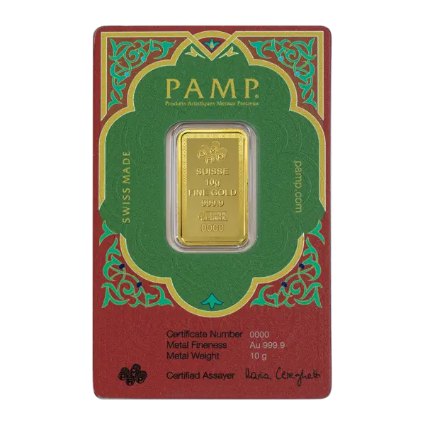 Our stunning PAMP 10g PAMP Branded Ayatul Kursi gold bars are renowned for their high quality and sleek design. With LBMA (London Bullion Market Association) approval and 99.99% purity, these are fantastic products for collectors and investors. These 24 Carat 10g gold bars come in a sleek credit card-sized package, also available in the highly popular Lady Fortuna or Rose design.