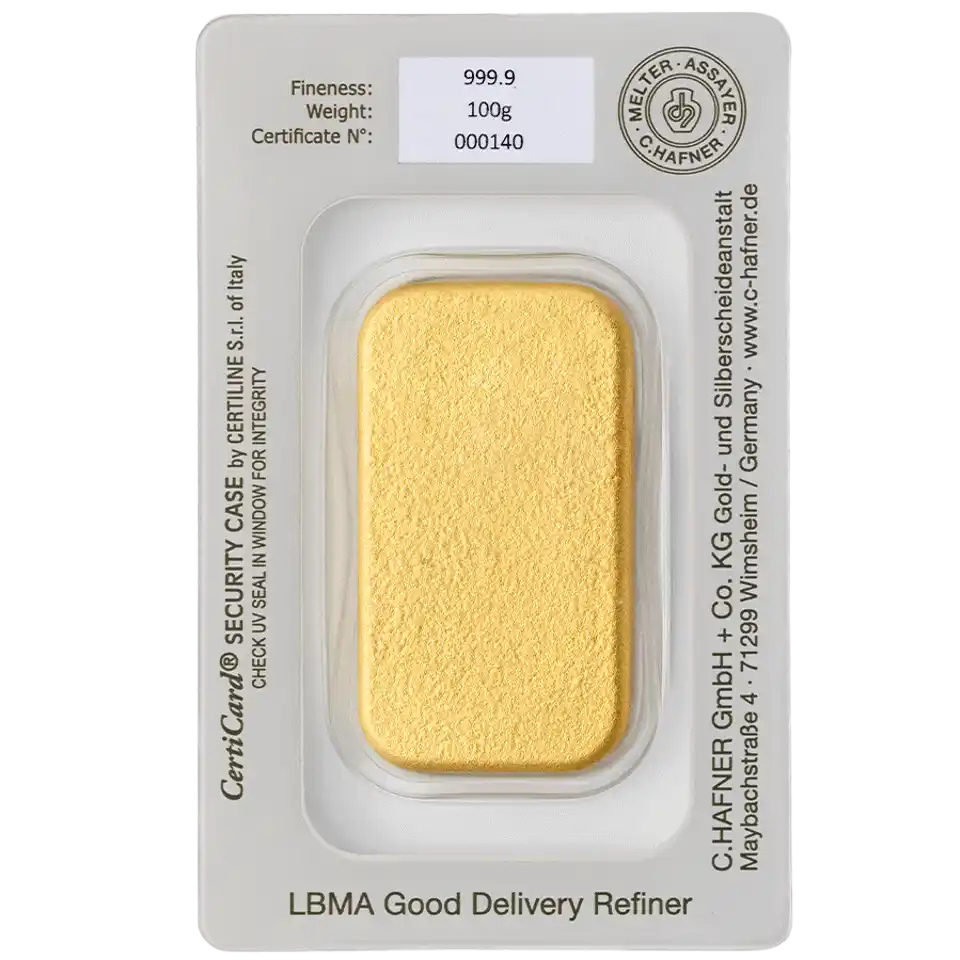 Our German-made 100 gram C.Hafner cast gold bars boast 24 Carats, 99.99% purity, and are LBMA approved, making them a great option for first-time investors and collectors.