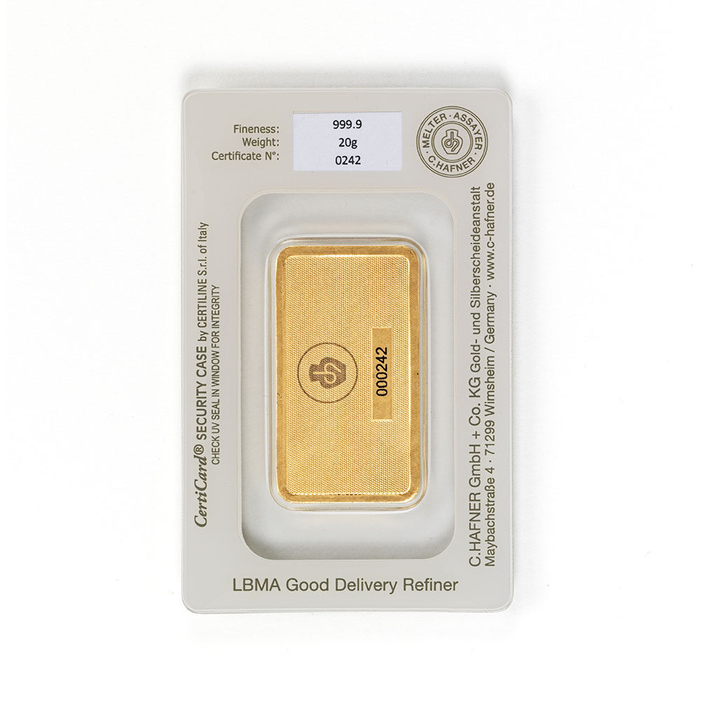 Our German-made 20 gram C.Hafner gold bars boast 24 Carats, 99.99% purity, and are LBMA approved, making them a great option for first-time investors and collectors.