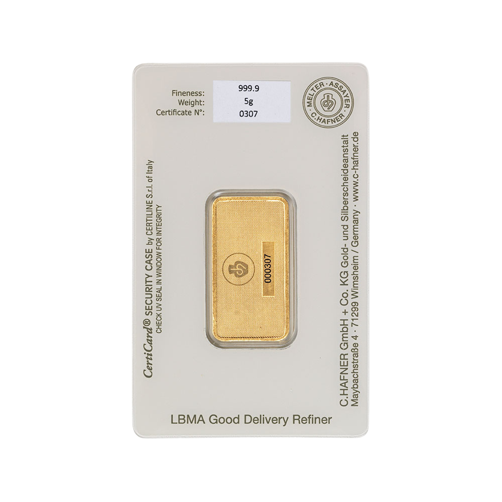 Our German-made 5 gram C.Hafner gold bars boast 24 Carats, 99.99% purity, and are LBMA approved, making them a great option for first-time investors and collectors.
