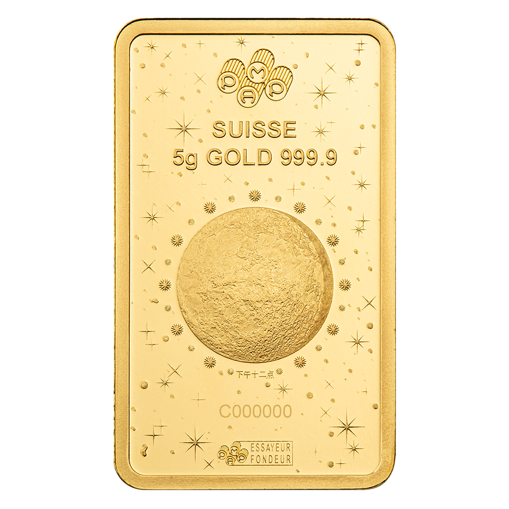 Displays a full moon design with starry details, along with PAMP’s logo, weight, purity, and individual serial number.