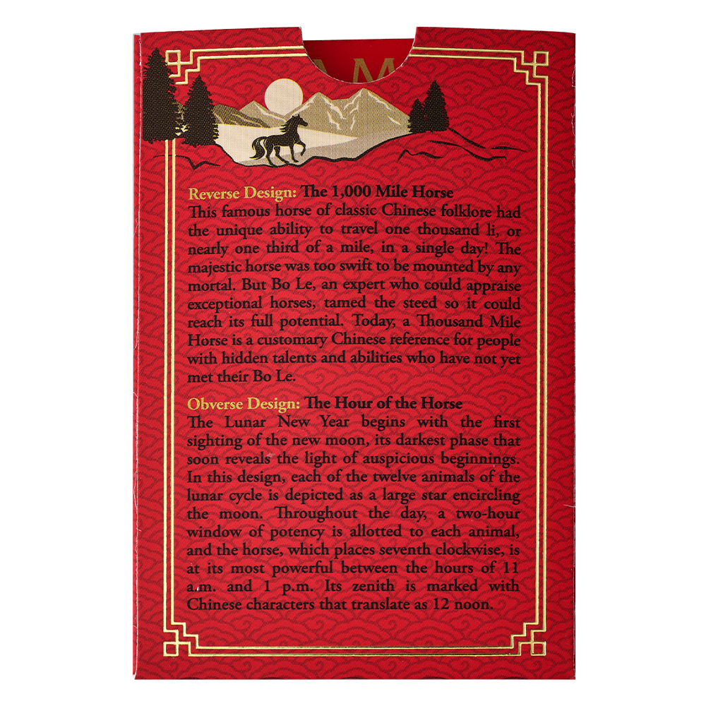 Features the 1,000 Mile Horse, a symbol of legendary strength and spirit, rearing against a rugged landscape with the Chinese character for Horse above
