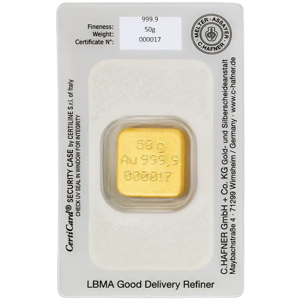 Our German-made 50 gram C.hafner gold bars boast 24 Carats, 99.99% purity, and are LBMA approved, making them a great option for first-time investors and collectors.
