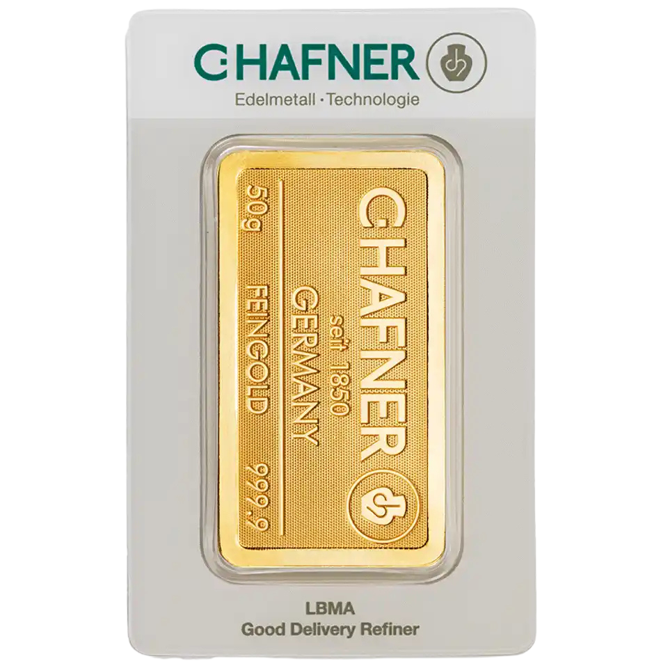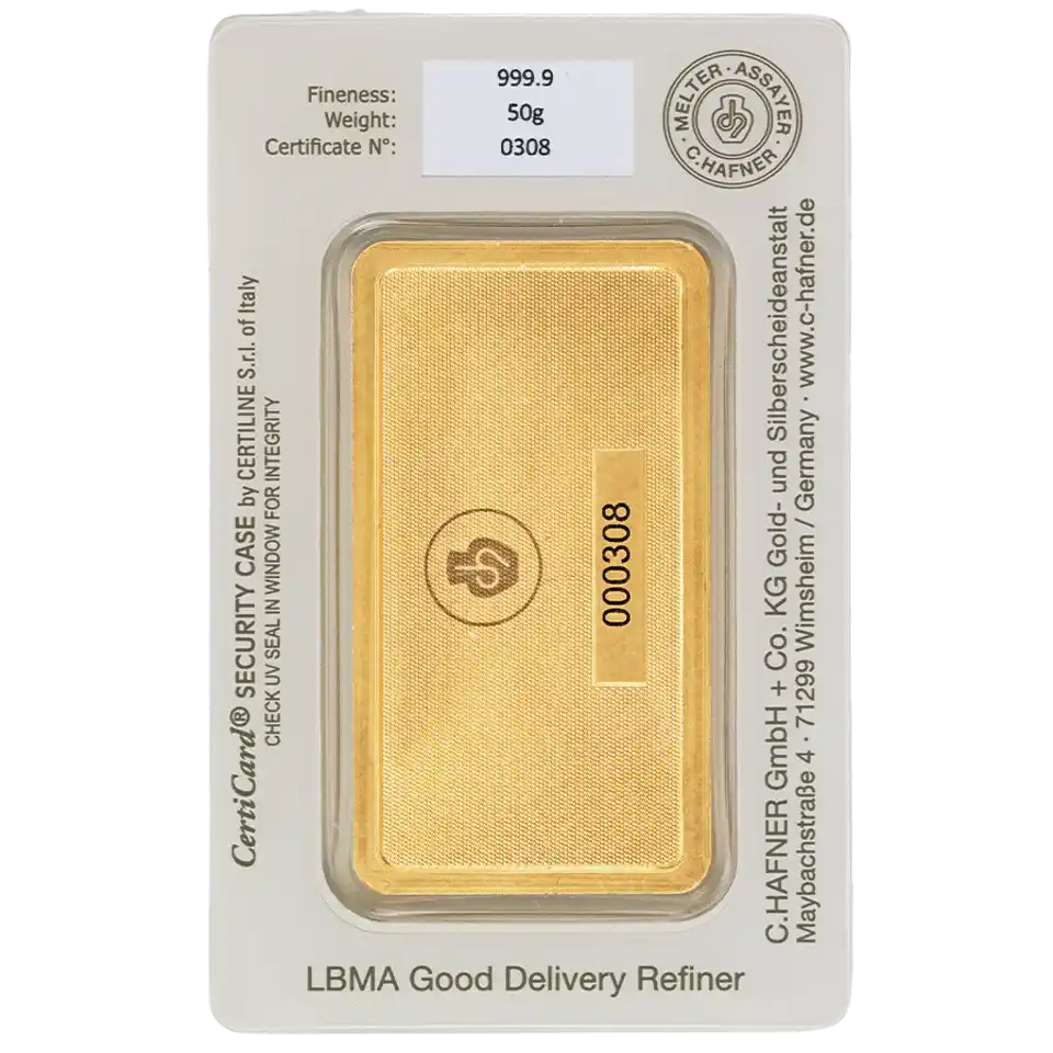 Our German-made 50 gram C.Hafner gold bars boast 24 Carats, 99.99% purity, and are LBMA approved, making them a great option for first-time investors and collectors.
